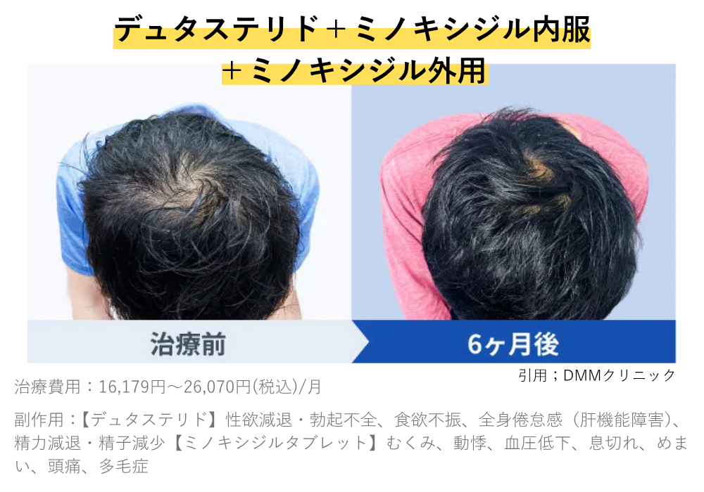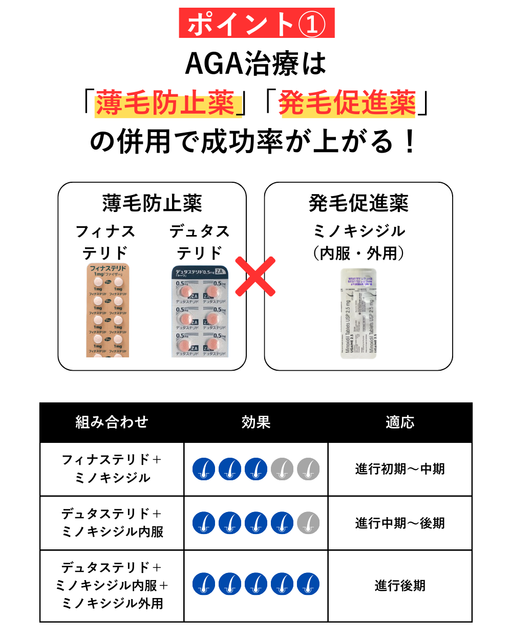 「薄毛防止」だけやっておけば良いと考える人もいるかもしれませんが、今ある毛量以上に増やしたい(若い頃のような毛量を取り戻したい)と考える人は、「発毛促進」も併用することで、効率の良いAGA治療ができます。