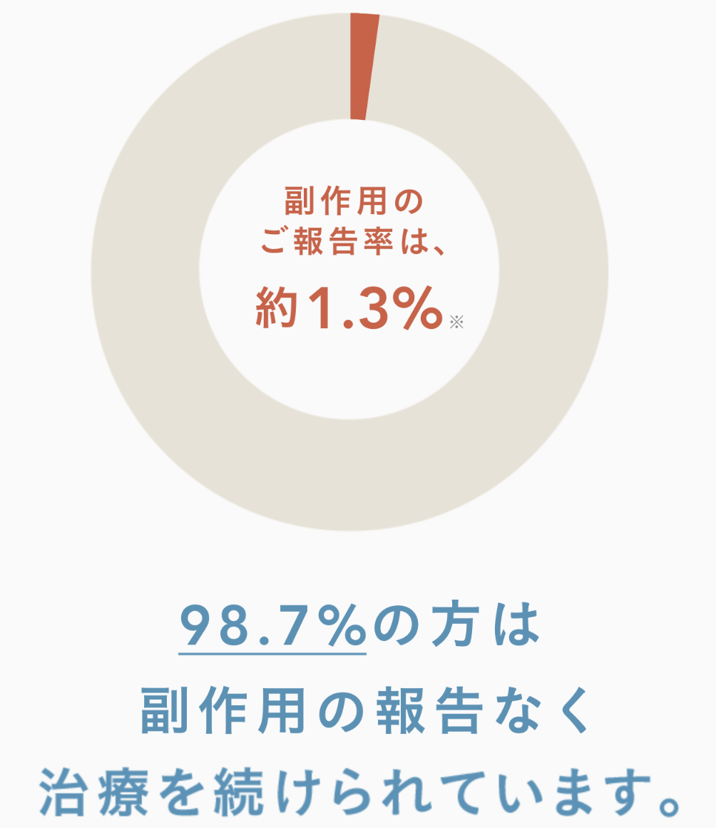 万が一、治療を継続することが困難になるほどの副作用が生じた場合、全額返金保証をしてくれるため、副作用が不安な方におすすめです。